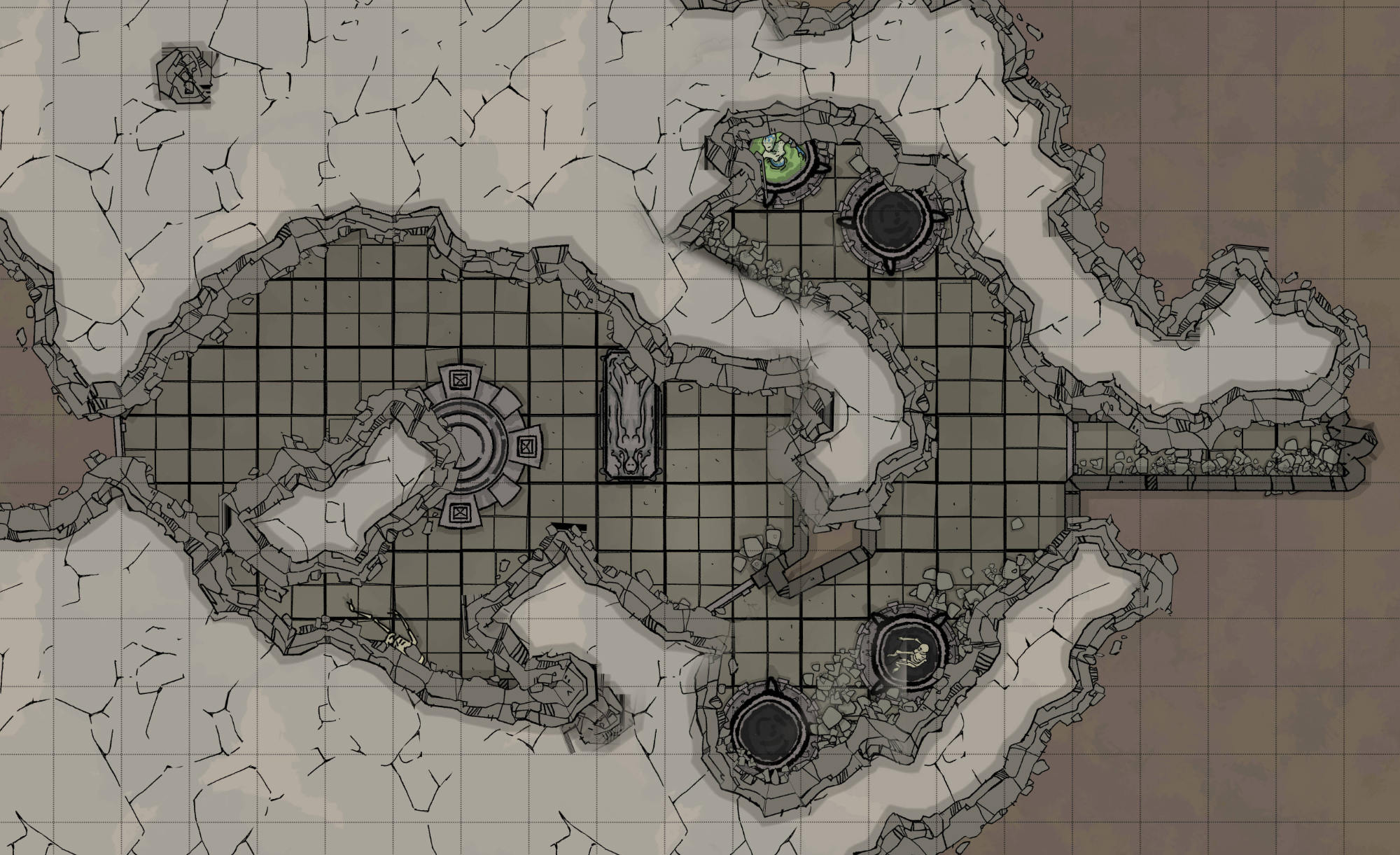 In the next room, Ligs saw a pair of ward runes on the floor, similar in shape and construction to the first, larger one they’d seen. Arising from one of the circles was a ring of metal and stone that enclosed the bottom of a cylindrical glass tank that stretched to the ceiling. The tank glass on the right was completely broken and the space empty, save for debris. The tank on the left was partially intact and contained the skeleton of an Illithid similar to the one strapped to the examination table in the previous room.