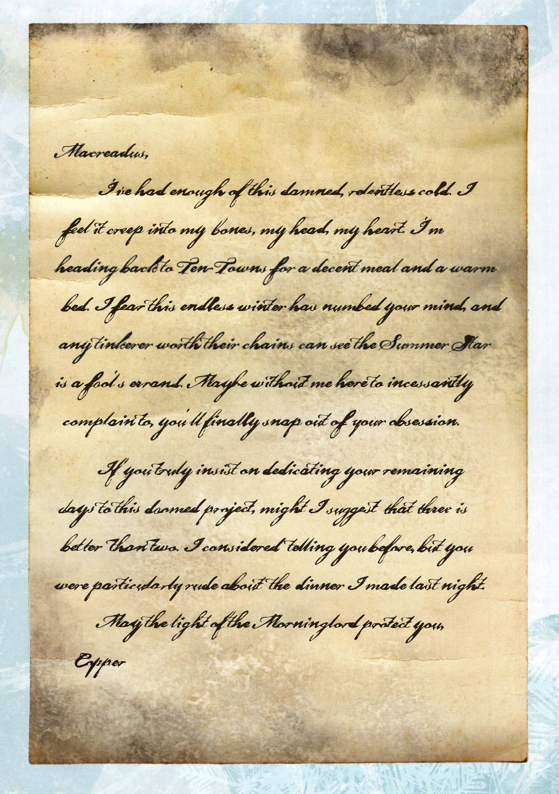 I’ve had enough of this damned, relentless cold. I feel it creep into my bones, my head, my heart. I’m heading back to Ten-Towns for a decent meal and a warm bed. I fear this endless winter has numbed your mind, and any tinkerer worth their chains can see the Summer Star is a fool’s errand. Maybe without me here to incessantly complain to, you’ll finally snap out of your obsession.