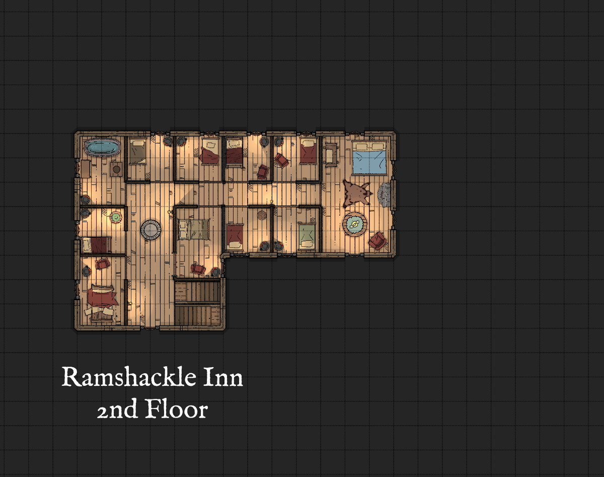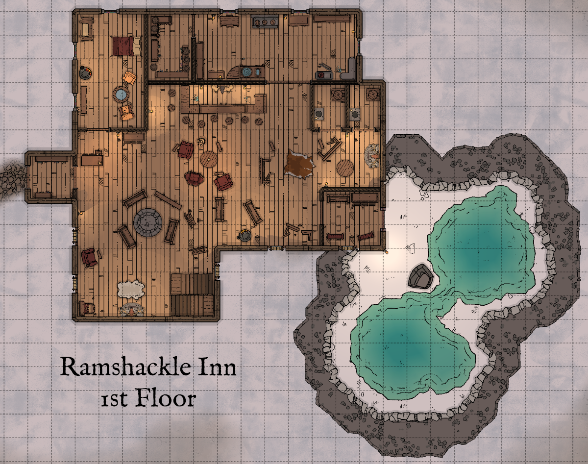 The Ramshackle was a short walk from Nimsy's house. It was a sturdy, two-story inn that had seen its share of deferred maintenance, though the inside was dry and warm enough once a fire had been built. Out back, Ligs found a pair of hot geothermal pools that refreshed the travel-weary dwarf. After Sanhar had been posted at the front door as the night watchman, everyone picked a room for themselves on the second floor and turned in for the night.